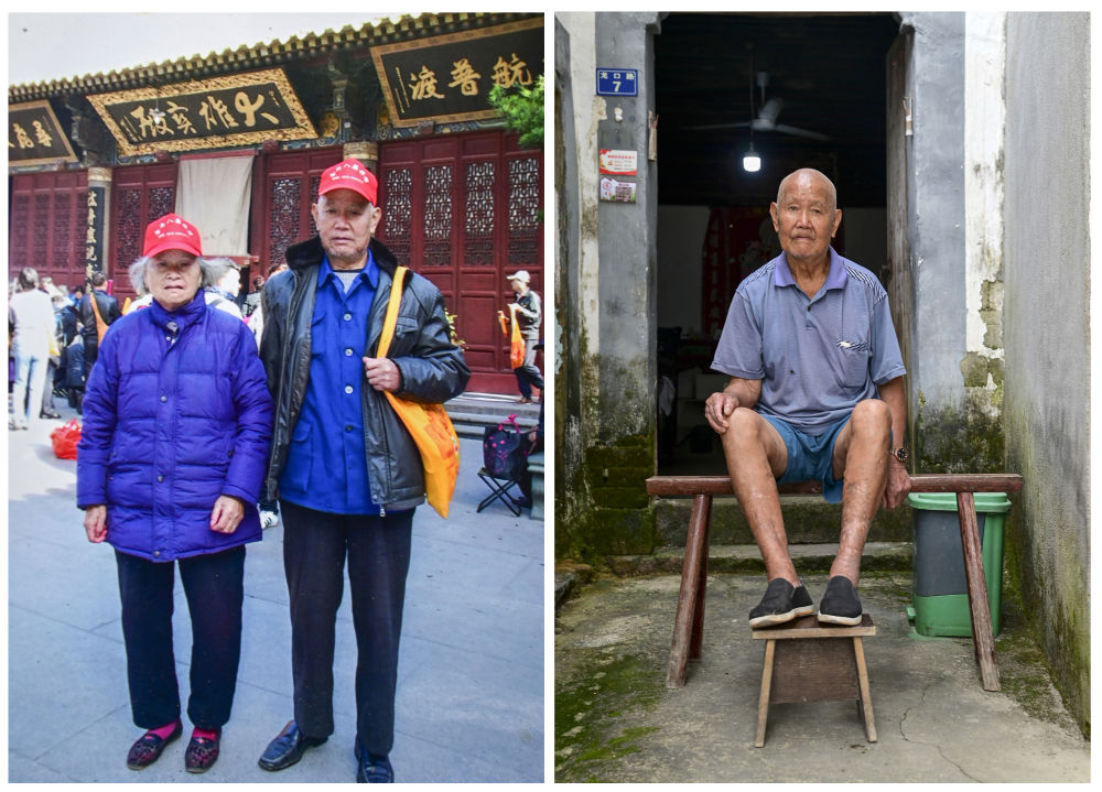 ↑拼版照片:左图为2010年10月,包礼荣和妻子在外旅游时合影(资料照片);右图为2021年9月3日,包礼荣坐在金华市婺城区沙畈乡潭背村家门口留影(胡肖飞 摄)。