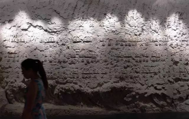 参观者经过沈阳九一八历史博物馆内的《义勇军进行曲》浮雕墙。新华社记者李钢摄