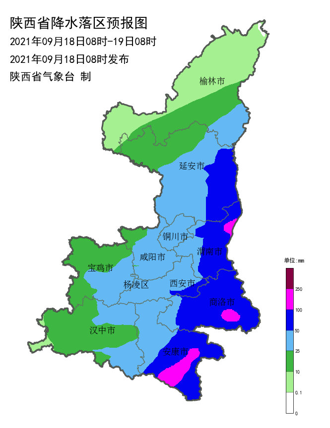 陕西省气象台2021年09月18日08时00分升级发布暴雨黄色预警:受低涡切变影响,预计9月18日08时至9月19日08时,陕北东南部、关中大部、陕南中东部有大雨(20~45毫米),其中延安延川、延长、宜川、黄龙,渭南白水、澄城、大荔、华洲、华阴、潼关,西安蓝田、长安区,商洛大部地区,安康汉滨区、旬阳、紫阳、白河、镇坪等县区局地有暴雨(50~70毫米),其中渭南韩城市、合阳,商洛丹凤、山阳、商南,安康旬阳、岚皋、平利等县区(市)局地可能有大暴雨(100~130毫米),过程期间最大小时雨强20~30毫米,上述地区的相邻县区也需高度关注。强降水影响区域易出现滑坡、泥石流、崩塌等地质灾害,山洪和中小河流洪水气象风险等级高,请做好应急准备工作,关注当地预警信号和短临预报,适时采取应急措施。