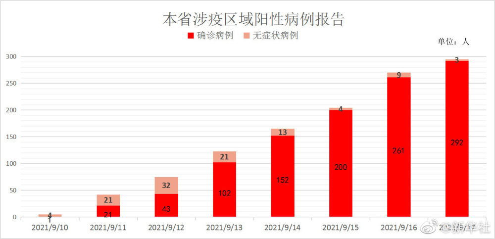 自9月10日以来,福建省累计报告本土确诊病例292例,目前住院292例,无死亡病例;现有本土无症状感染者尚在接受集中隔离医学观察3例(莆田市3例)。(记者邓倩倩,图表来源:福建省卫健委)