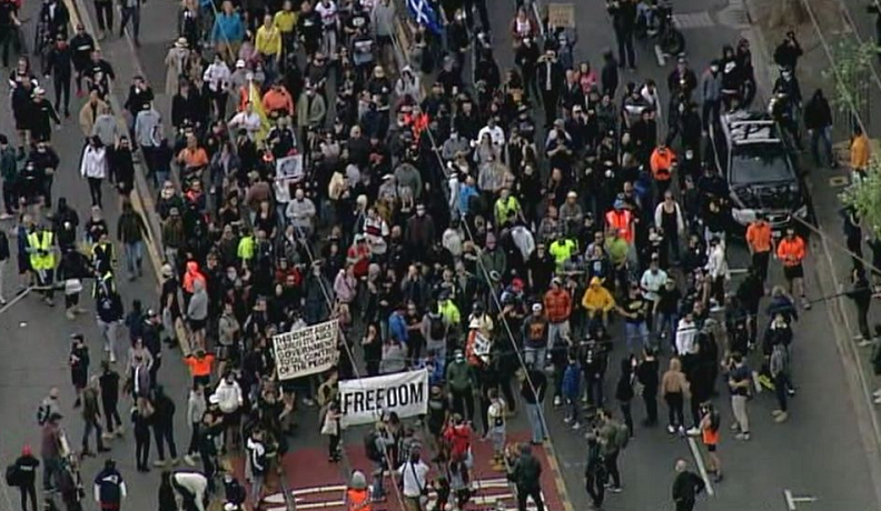 澳大利亚第二大城市墨尔本当地时间18日爆发反“封城”游行。数百名民众在维多利亚州首府墨尔本街头举行集会,高喊“拒绝封城”口号,反对州政府实施的防疫措施。现场多数示威者没有佩戴口罩。