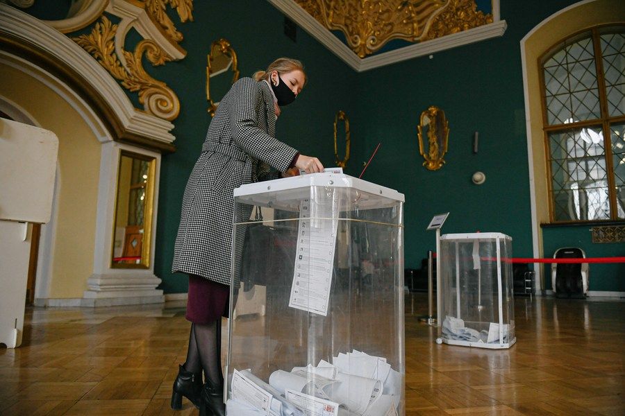 9月17日,一名女子在俄罗斯首都莫斯科设立于火车站内的投票点投票。第八届俄罗斯国家杜马(议会下院)选举17日开始投票。此次选举从17日持续至19日。(新华社发,叶甫盖尼·西尼岑摄)