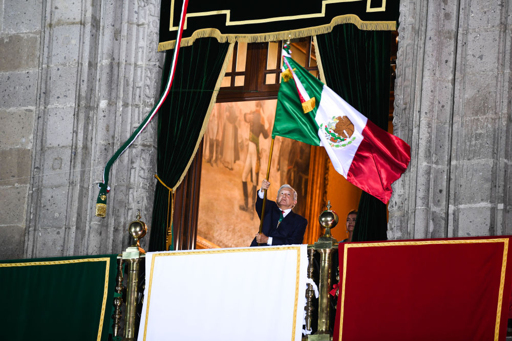 ↑9月15日,墨西哥总统洛佩斯在首都墨西哥城中心的国家宫出席独立日庆祝活动时挥舞国旗。