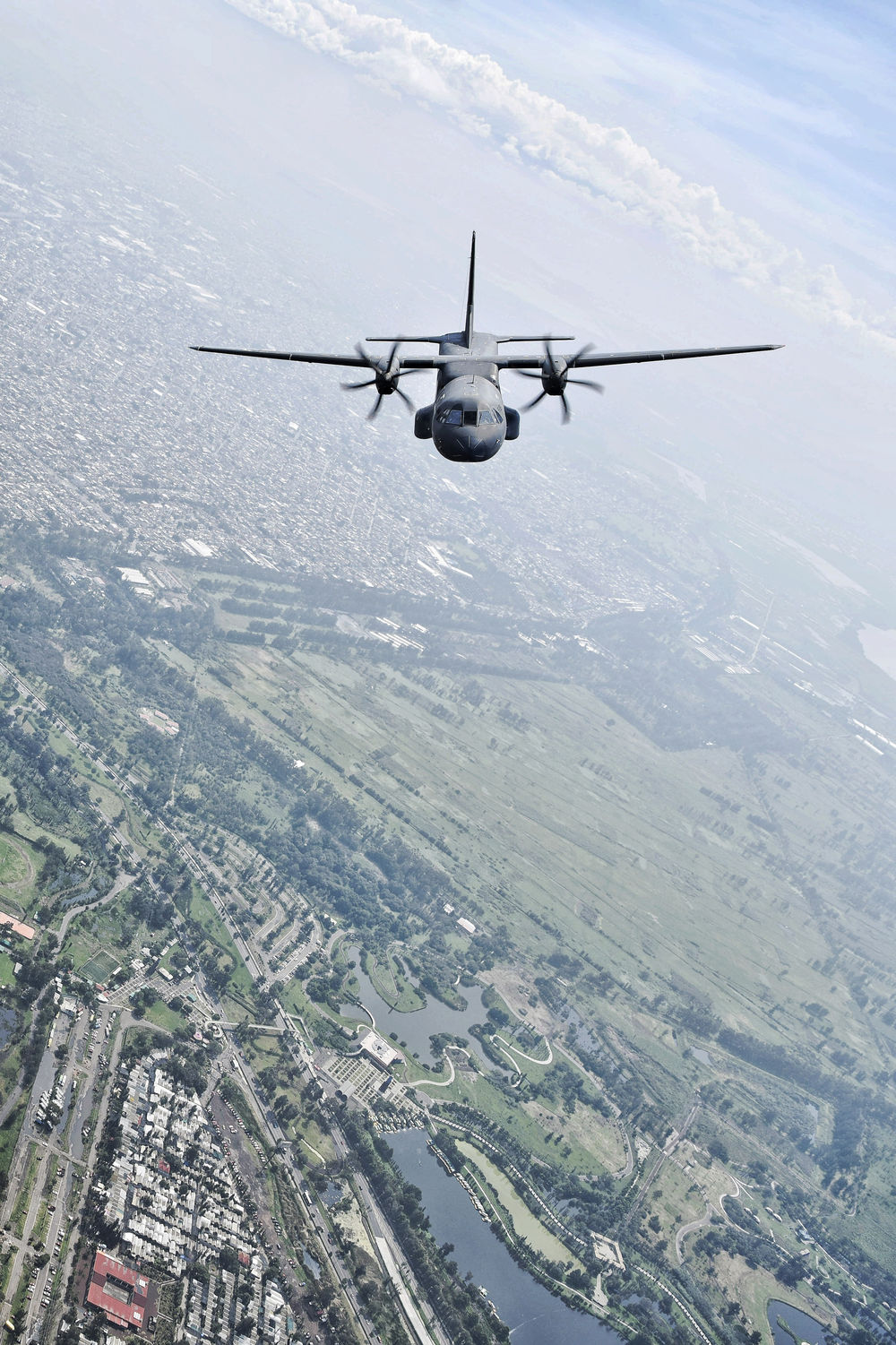 我拍摄的是运输机编队,上午10点,飞行编队依次起飞,低空飞行,朝着阅兵式主会场——墨西哥城宪法广场飞去。飞行了大约10分钟,我所乘坐的运输机编队长机就打开了后舱门,允许我们透过打开的后舱门拍摄参阅编队。在机械师的指导下,大家将事先穿戴好的安全绳与机身上的保护钩相连,趴在后舱,近距离拍摄参阅军机。