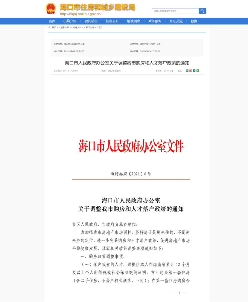据海南省海口市人民政府办公室9月18日发布的《关于调整海口市购房政策和人才落户政策的通知》,将对海口市购买商品住房和人才落户政策进行调整,政策自发布之日起实施。