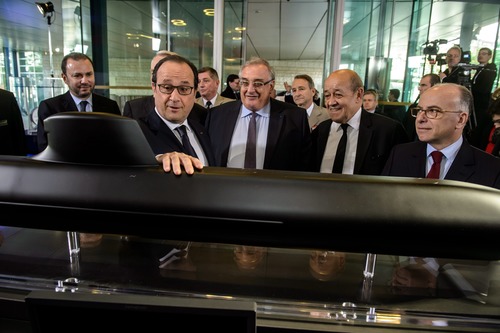 2016年4月26日,在巴黎的法国海军造船厂总部,时任法国总统奥朗德(左二)观看一台潜水艇模型。时任澳大利亚总理特恩布尔当天在南澳大利亚州首府阿德莱德宣布,法国海军造船局已赢得潜艇建造合同。新华社/欧新中文