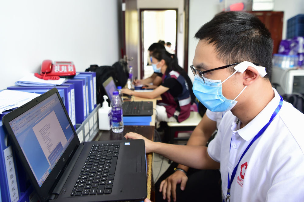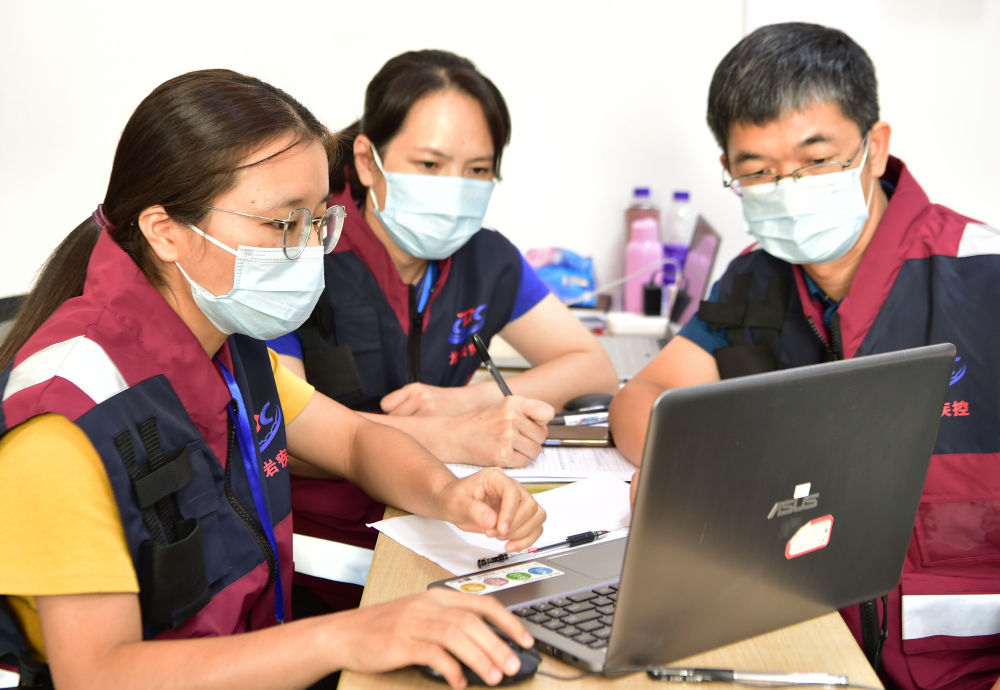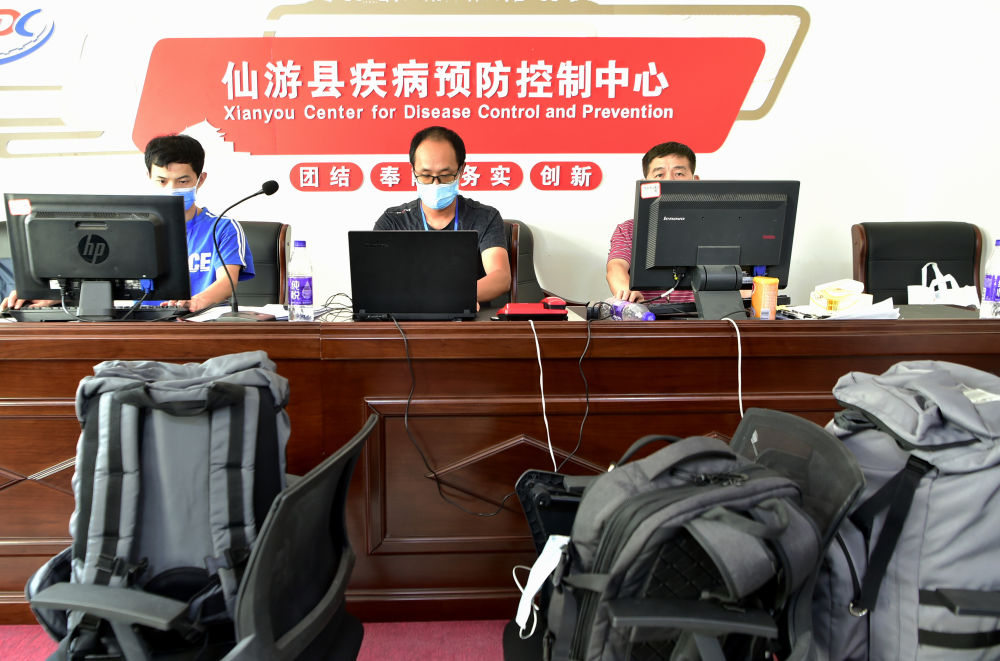 ↑9月18日,在莆田仙游县疾病预防控制中心,来自龙岩疾控中心的段丽芳(中)、林凤芹(左)和胡全斌在合作摸排信息。