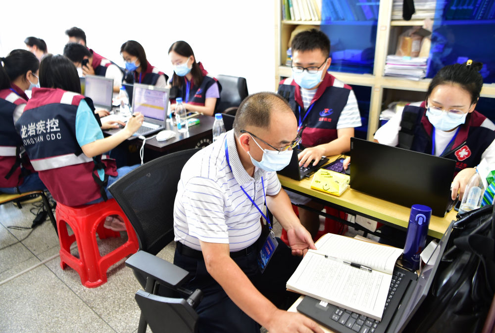 ↑9月18日,在莆田仙游县疾病预防控制中心,来自莆田市涵江区的流调员们加班加点排查信息。