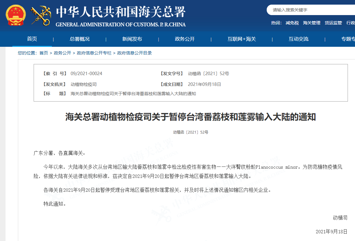 各海关自2021年9月20日起暂停受理台湾地区番荔枝和莲雾报关,并及时将上述情况通知辖区内相关企业。