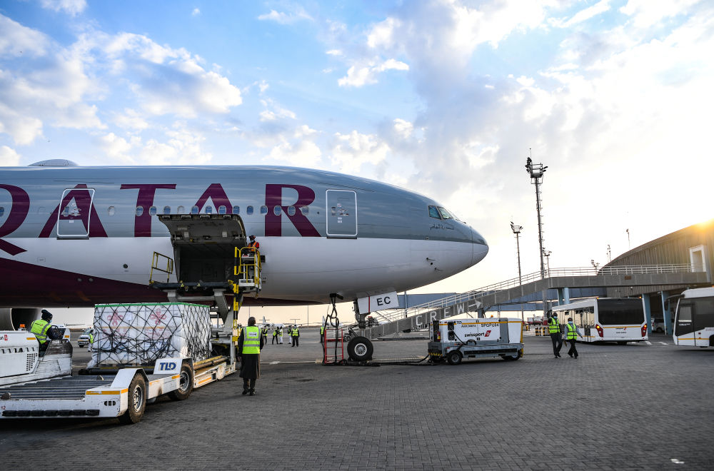 9月18日,在肯尼亚首都内罗毕,机场工作人员从飞机上卸下中国政府援助的新冠疫苗。新华社记者李琰摄