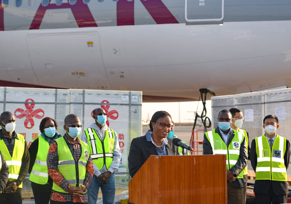 9月18日,在肯尼亚首都内罗毕,肯尼亚卫生部常务副部长苏珊·莫察切在疫苗交接仪式上发言。新华社记者李琰摄
