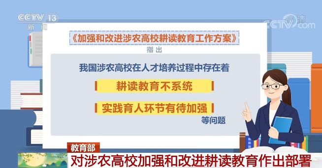《方案》指出,我国涉农高校在人才培养过程中存在着耕读教育不系统、实践育人环节有待加强等问题。加强和改进涉农高校耕读教育,让学生走进农村、走近农民、走向农业,对提升学生学农知农爱农素养和专业实践能力,培养德智体美劳全面发展的社会主义建设者和接班人具有重要意义。
