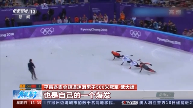 39秒584,短道速滑男子500米决赛,武大靖的成绩打破了世界纪录,强势夺冠。