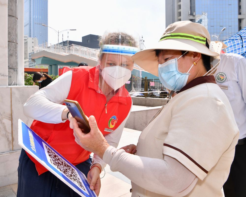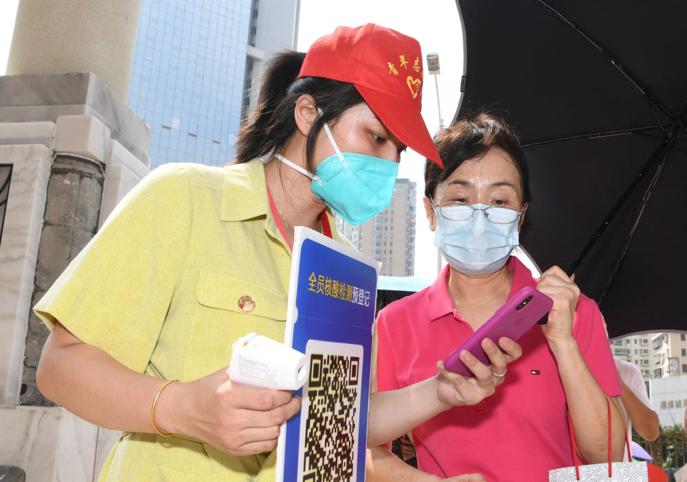 ↑9月18日,在厦门海湾新城核酸检测点,来自塞尔维亚的志愿者安娜(右一)在协助市民进行核酸检测扫码登记。