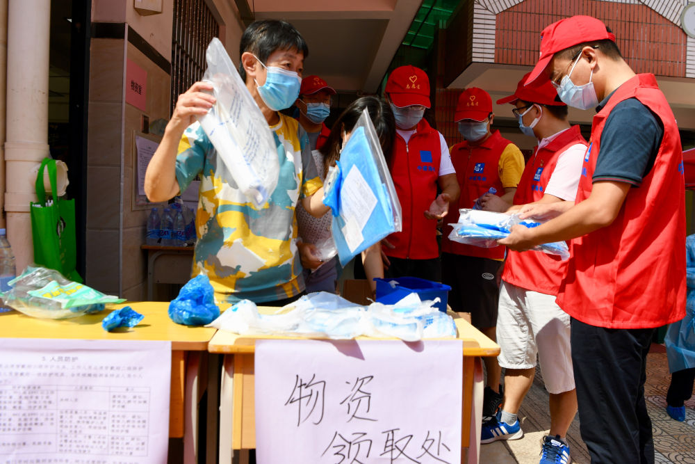 ↑9月19日,在厦门松柏中学核酸检测点,志愿者为市民发放用于核酸检测取样的棉签。
