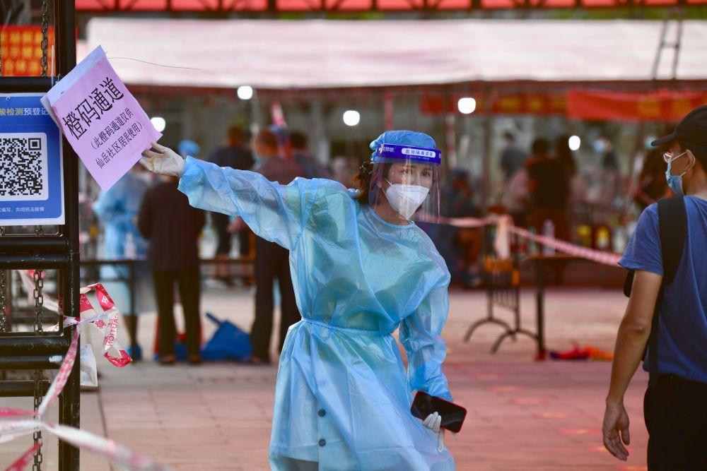 ↑9月18日,在厦门五一文化广场核酸检测点,社区志愿者吴文谅引导居民进行核酸检测取样。