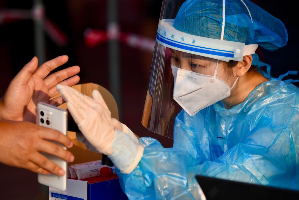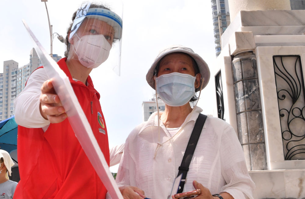 ↑9月18日,在厦门海湾新城核酸检测点,来自捷克的志愿者潘淑娜(左)协助受检人员进行核酸检测登记。