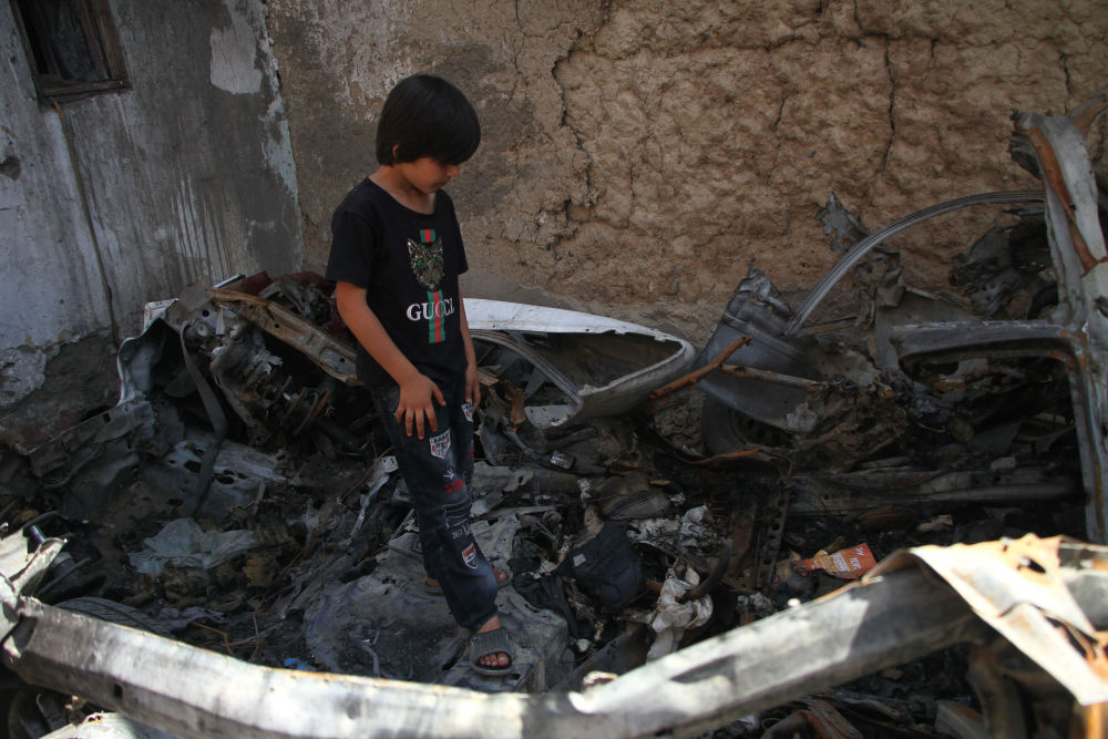 9月18日,在8月29日被美军无人机袭击的阿富汗喀布尔居民区,遇难者亲人站在汽车残骸上。新华社发(塞夫拉赫曼·萨菲摄)