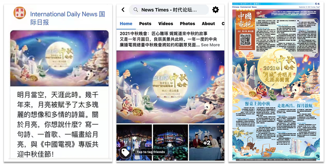 美国《国际日报》发布了《2021年中央广播电视总台中秋晚会》的定档预告、精美海报和“给月亮的情诗”等征集活动,并策划制作“中秋节专刊”,积极宣推总台秋晚的优质内容,近日在北美和菲律宾的报纸、新媒体端刊载。