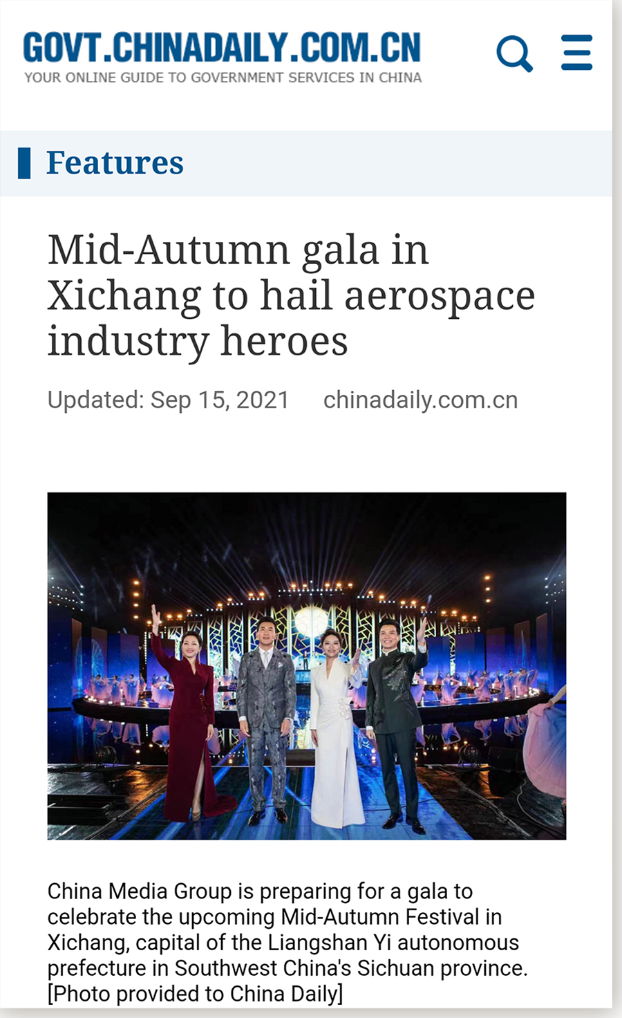 《中国日报》刊发英文报道《Mid-Autumn gala in Xichang to hail aerospace industry heroes》,对晚会选址、舞美、节目等方面体现出的“秋晚品质”加以肯定。报道评价道:“从目前公开的内容来看,无论是与晚会契合度极高的巧妙选址,还是科技与艺术效果交融,古今结合的舞美效果,以及精心雕琢传递多重关怀的节目编排,都体现了今年秋晚的品质与匠心”。《时代论坛报》刊发题为《2021中秋晚会:匠心雕琢 娓娓道来中秋的故事》的文章,也着重报道了晚会的匠心之笔。