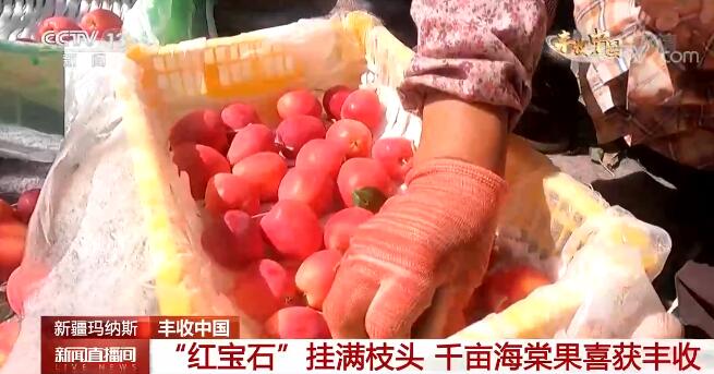 央视网消息:眼下,新疆玛纳斯县2000多亩锦绣海棠果进入了收获期,红彤彤的果实挂满枝头像一颗颗红宝石,浓浓果香飘散在整个果园。
