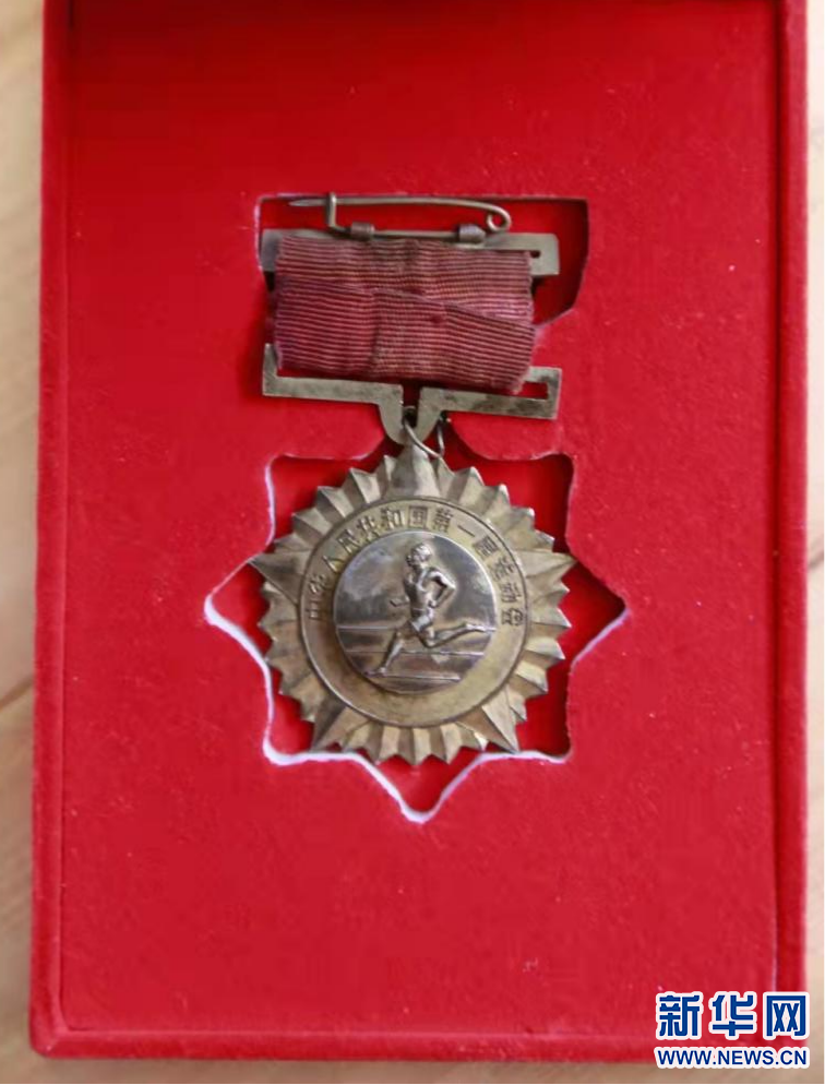 呼和勒在第一届全国运动会中获得的冠军奖牌。新华网发(张圆 摄)