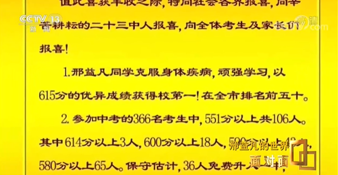 2018年,邢益凡给所有关心他的人一个大大的惊喜,他以全校第一名的成绩考上了当地的重点中学吉林一中。