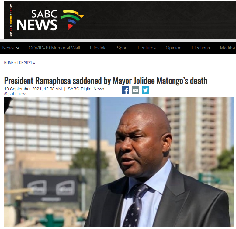 据南非国家电视台当地时间9月19日报道,南非最大城市约翰内斯堡市市长乔丽迪·马通戈(Jolidee Matongo)于9月18日晚,陪同南非总统拉马福萨参加索韦托地方政府选民登记活动后,因车祸去世。