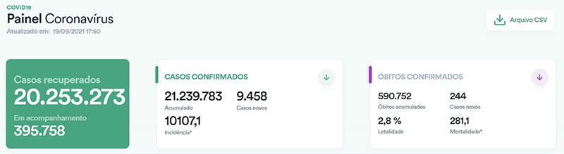 截至当地时间9月19日,根据巴西卫生部发布的数据,巴西累计新冠肺炎确诊病例21239783例,较前一日新增9458例;累计死亡病例590752例,较前一日新增244例;累计治愈病例20253273例。