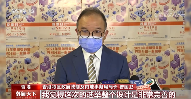 香港特区政府政制及内地事务局局长 曾国卫:我觉得这次的选举整个设计是非常完善的,代表每一个市民的整体的利益,香港的根本利益主要是要体现,还有落实好“爱国者治港”。
