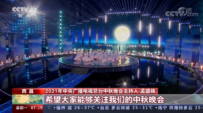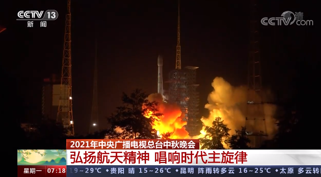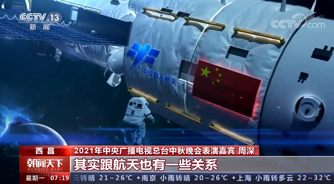 2021年中央广播电视总台中秋晚会主持人 孟盛楠:这个很大的惊喜是来自三位航天员,他们是聂海胜、刘伯明和汤洪波,他们用外太空的全新视角带给我们一份惊喜。希望大家能够关注我们的中秋晚会,届时我们在现场一起拆礼物吧。