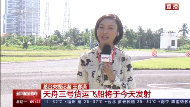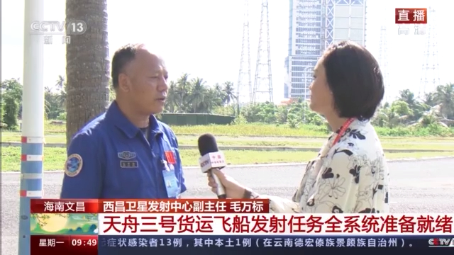 总台央视记者 王春潇:目前火箭和货运飞船的状态怎么样了?要分享三个好,此时此刻的文昌卫星发射场,天气好、火箭好、飞船好。当然这三个好不是我说的,是发射场的负责人说的,刚刚请到了西昌卫星发射中心的副主任毛主任跟我们分享发射场的最新信息。