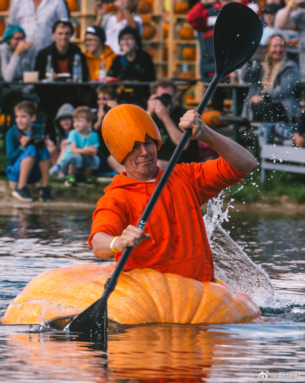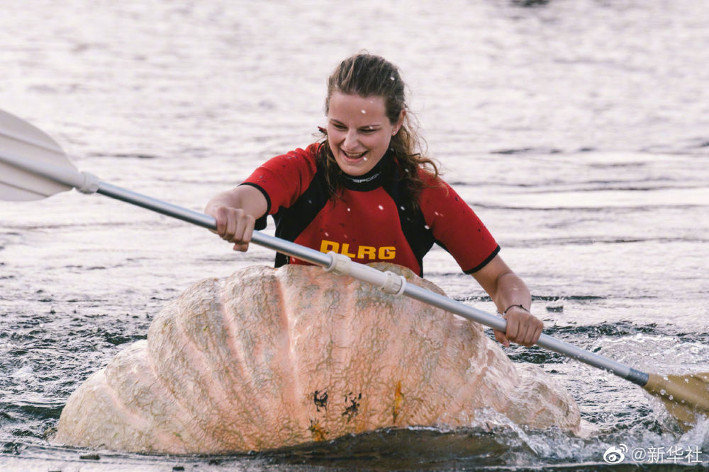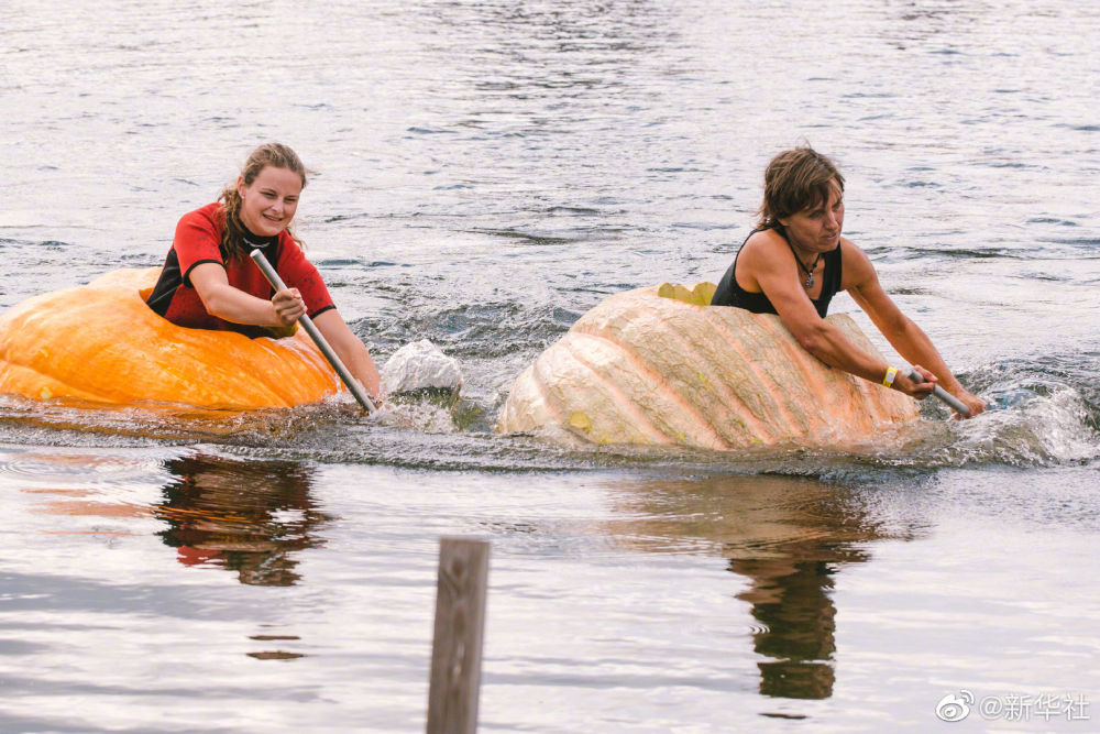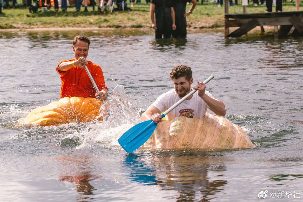 【德国南瓜船比赛】9月19日,人们在德国梅谢尼希参加趣味“南瓜船”比赛。选手们将被挖空的巨型南瓜当做小船,用桨划水前行。据悉,为庆祝南瓜丰收,德国科隆市附近一农庄举办传统南瓜节,期间举办南瓜趣味称重比赛、“南瓜船”比赛以及南瓜雕塑展等活动,吸引民众前来参观游玩。