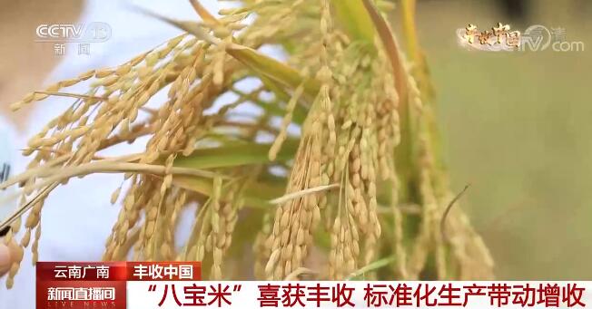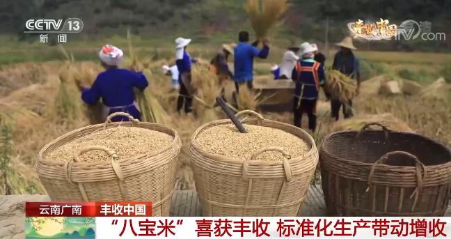 央视网消息:眼下正是秋收时节,云南广南八宝镇3万多亩“八宝米”喜获丰收,今年平均亩产达到400公斤以上,比去年增加20%左右。