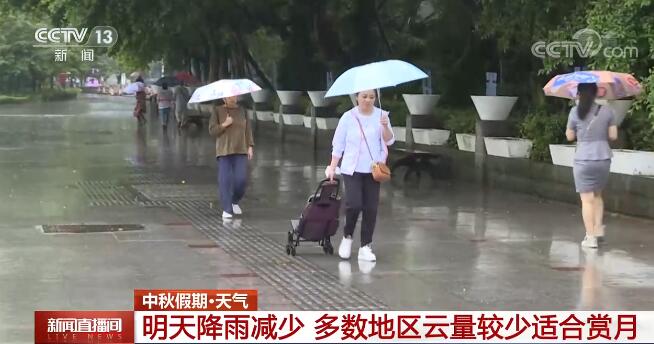 央视网消息:来关注中秋假期的天气。假期前两天,我国雨水范围比较广泛,尤其是北方部分地区雨势较强。不过,随着降雨重心转移,明天全国降雨明显减少,时值中秋佳节,多数地方云量较少,适合赏月。