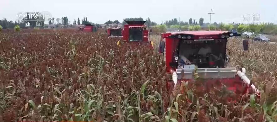 央视网消息:眼下,河北省景县全县10万亩红高粱喜迎丰收。正值高粱成熟收割季节,在王谦寺镇马贾庄村,当地农民正组织农机加紧收割。田地里机声轰鸣,多台农机来回穿梭,一片丰收景象。