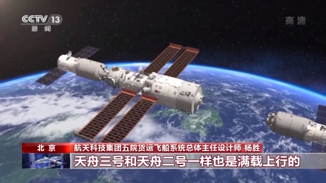 航天科技集团五院货运飞船系统总体主任设计师 杨胜:天舟三号和天舟二号一样也是满载上行的。这次大概带了有5吨的货,200多个货包。但是货的内容和比例是做了一定调整。经过天舟二号的验证,随着整个北斗(卫星)的全面应用,这次我们也是更加放心地使用快速交会对接技术。