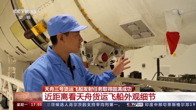 总台央视记者 李宁:天舟货运飞船一共有四个大眼睛,其中一个是监视探头,主要是监控太阳能帆板展开的过程。在前方还有一个探头,它主要是在交会对接的时候盯十字靶心。在货运舱里面还有两个探头,它们主要是来观测货物的使用情况和航天员的活动状态。还有一个探头位于货物舱的前端,主要是在和天和核心舱交会对接的过程中,记录这个过程的。