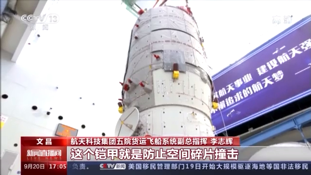 航天科技集团五院货运飞船系统副总指挥 李志辉:这个铠甲就是防止空间碎片撞击,一般达到2厘米以上会撞击出小孔。我们外面增加一层“防弹衣”的话,即使你把它撞破了(也)没关系,至少里面不会撞破。就像子弹一样,打了之后外面有一层“墙”挡着,那就碰不着人。