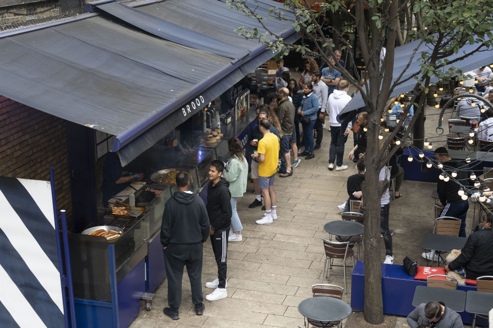 8月30日,人们在英国伦敦伯勒市场的一处食品摊位前选购。新华社发(雷伊·唐摄)