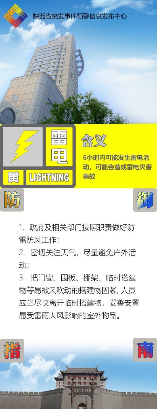 陕西省气象台2021年9月20日20时25分继续发布雷电黄色预警信号:目前关中北部及东部已出现雷暴大风天气,预计西安市未央区、阎良区、临潼区、长安区、蓝田县、新城区、碑林区、莲湖区、灞桥区、雁塔区、高陵区,铜川市印台区、耀州区、宜君县、王益区,咸阳市秦都区、渭城区、三原县、泾阳县,渭南市临渭区、合阳县、澄城县、白水县、富平县、华州区、潼关县、大荔县、蒲城区、华阴市,商洛市商州区、丹凤县、山阳县、柞水县、洛南县未来6小时内可能发生雷电活动,造成雷电灾害事故,并伴有6级以上雷暴大风或短时暴雨(10毫米/小时以上),局地风力可达8级以上,请注意防范。