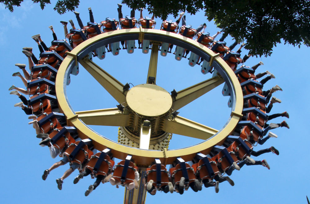 ↑2016年10月2日,游客在苏州乐园乘坐惊险的“龙卷风”游玩。新华社 发