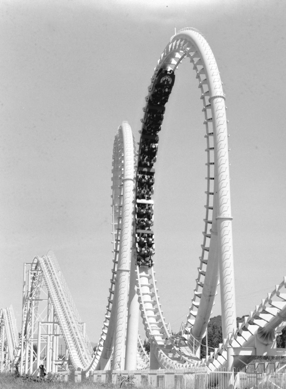 ↑1985年8月31日,北京密云国际游乐场正式开放接待游人。北京密云国际游乐场的大型翻滚过山车最高时速90公里,车轨总长1060米,高36米,乘客无不感到新奇惊险。新华社记者 郑书福 摄