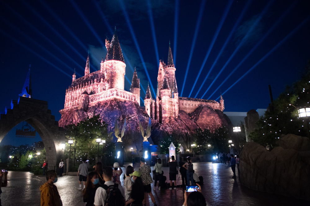 ↑2021年8月25日,游客在观看北京环球影城哈利·波特的魔法世界主题景区霍格沃茨城堡夜间灯光庆典表演。新华社记者 陈钟昊 摄
