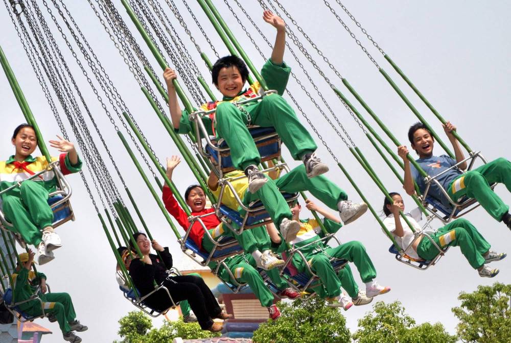 ↑2005年4月29日,民工子女们在温州乐园乘坐“波浪秋千”,乐得合不拢嘴。新华社 发