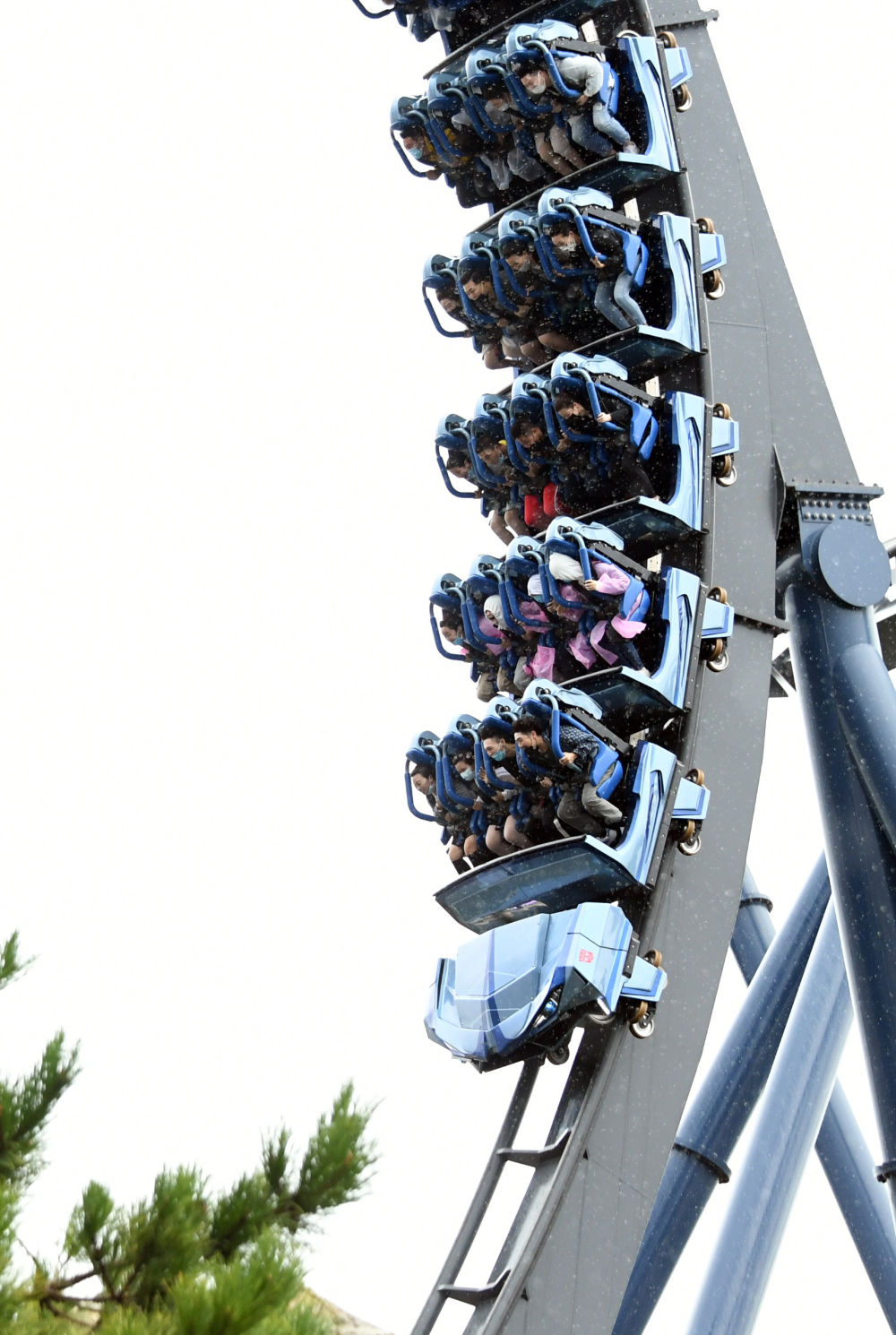 ↑9月20日,在北京环球影城主题公园,游客在北京环球度假区体验霸天虎过山车。新华社记者 任超 摄