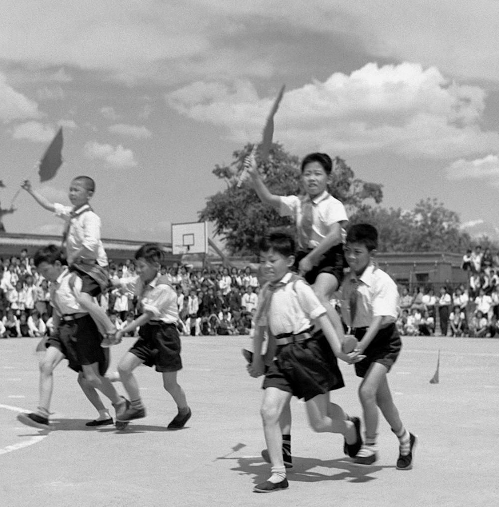 ↑1955年6月,在北京市“少年之家”新建的体育场上小朋友们进行“骑马”赛跑。新华社记者 喻惠如 摄