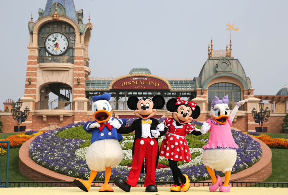 ↑2020年5月11日,演职人员在上海迪士尼乐园门口欢迎游客。新华社记者 任珑 摄