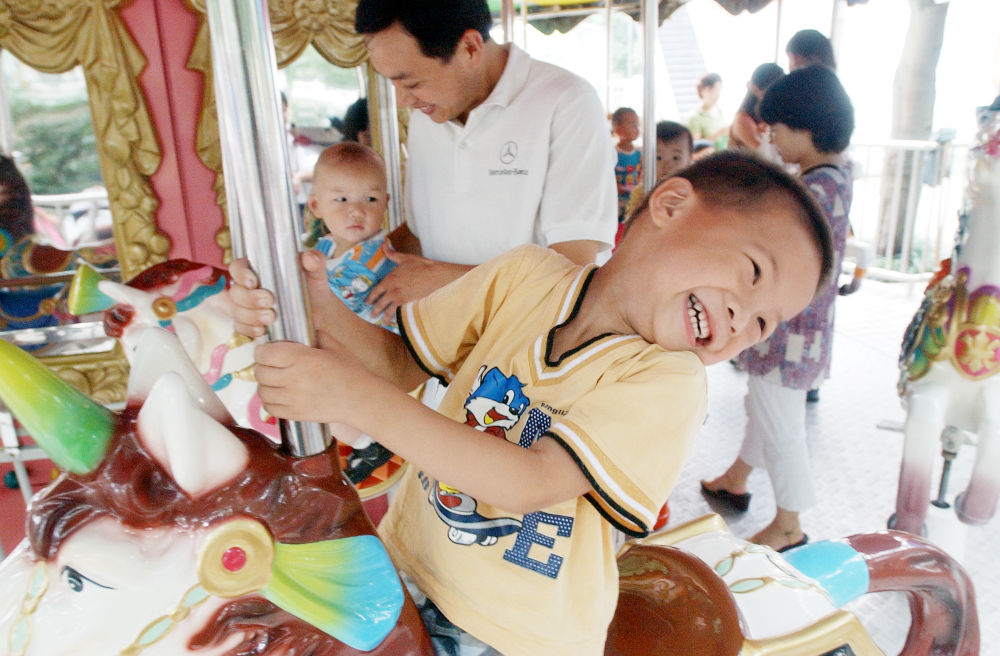 ↑2005年7月21日,在杭州市青少年宫,一名男孩在旋转木马上开怀大笑。新华社 发