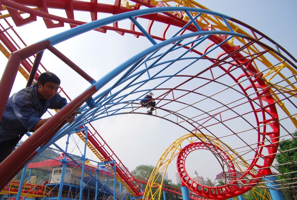 ↑2007年9月18日,一名油漆工人正在给重庆科普中心游乐园的设备刷油漆。新华社记者 刘潺 摄